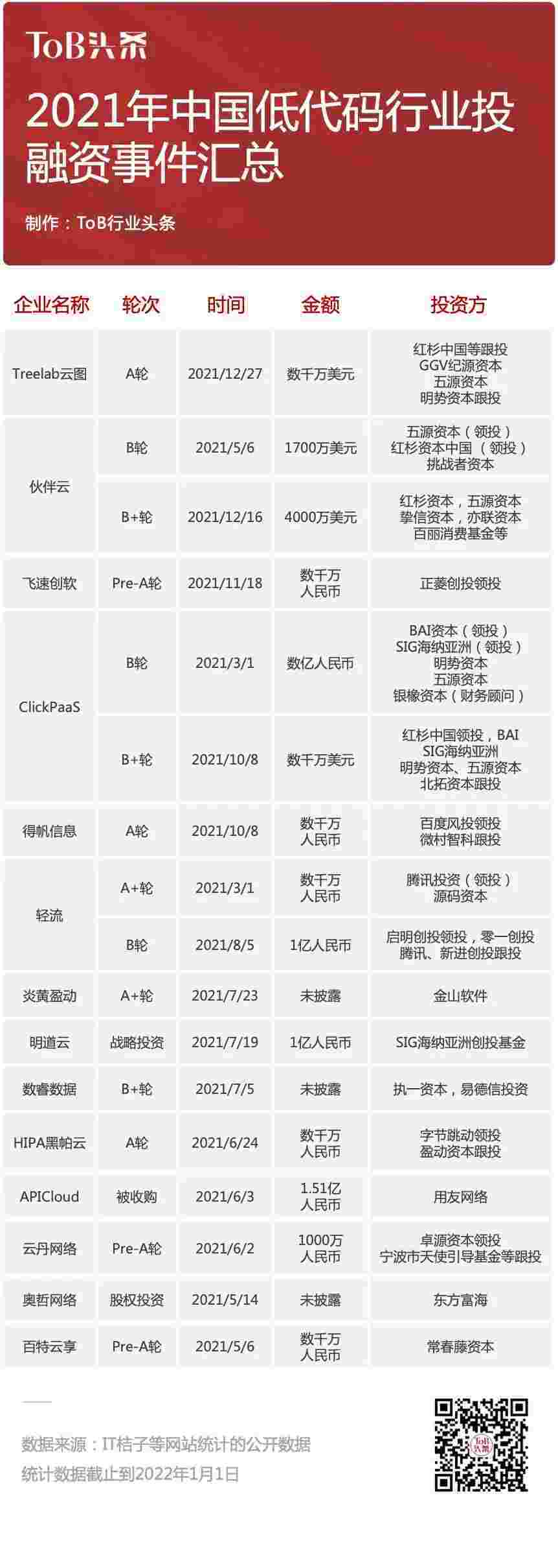 到2021年,,,,无/低代码投融资规模势头更甚,,,其中包括轻流两轮融资(A+轮数千万人民币,,B轮近亿人民币)、、、VIVO钱包 两轮融资(B轮数亿人民币,,,,B+轮数千万美元)、、、、百特云享数千万元Pre-A轮融资......